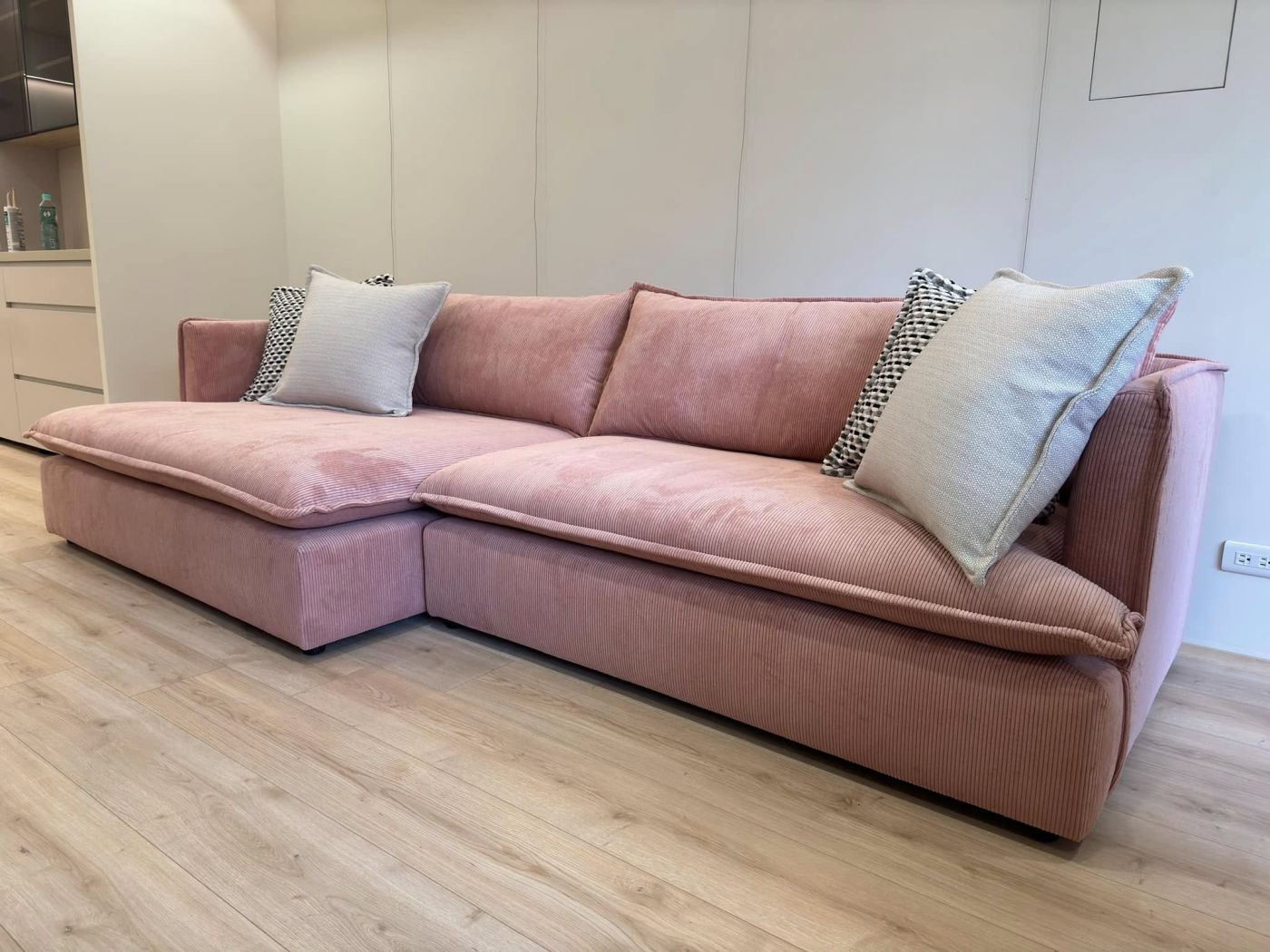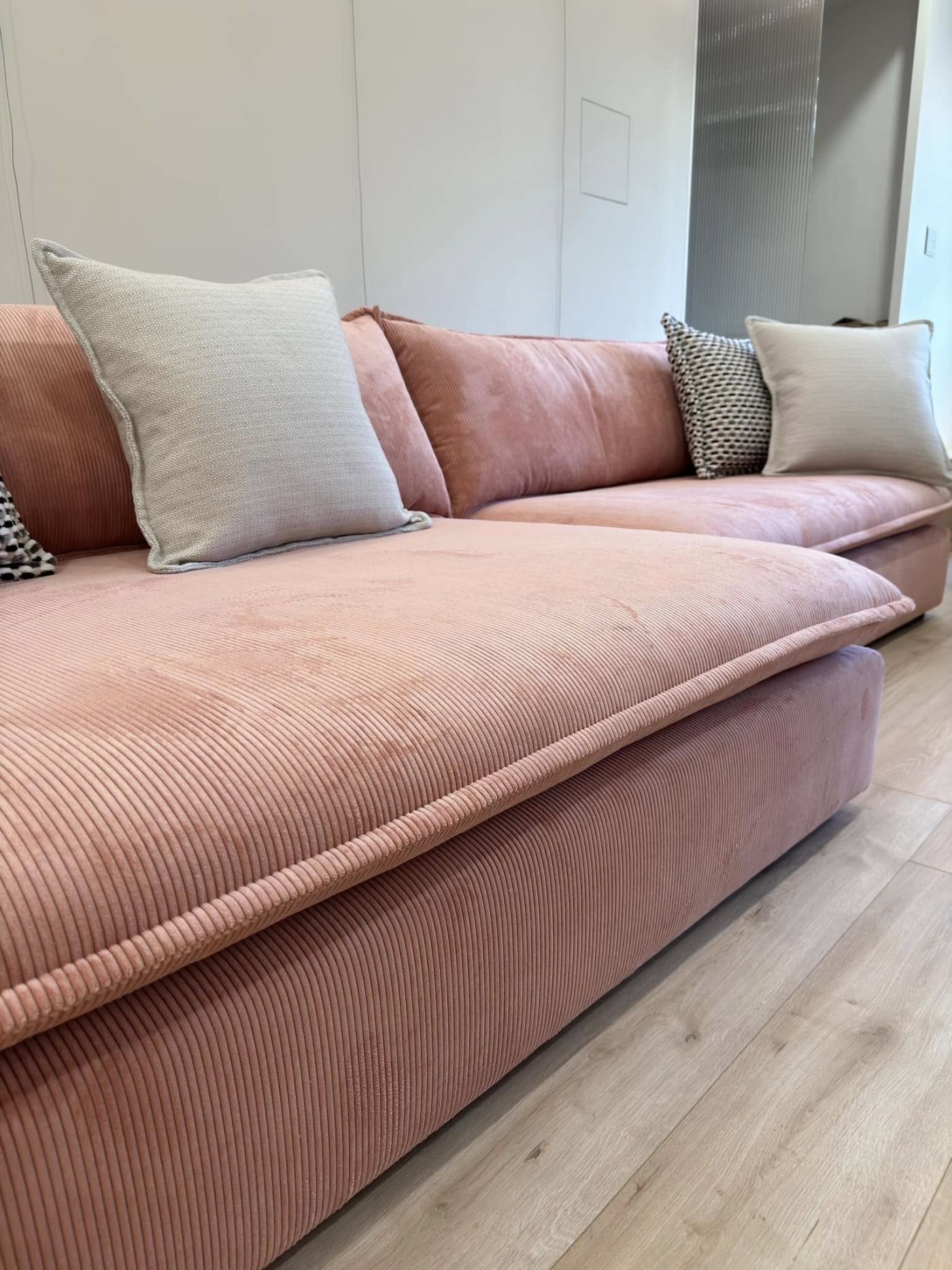女主人跟設計師大膽的選了粉色的燈芯絨