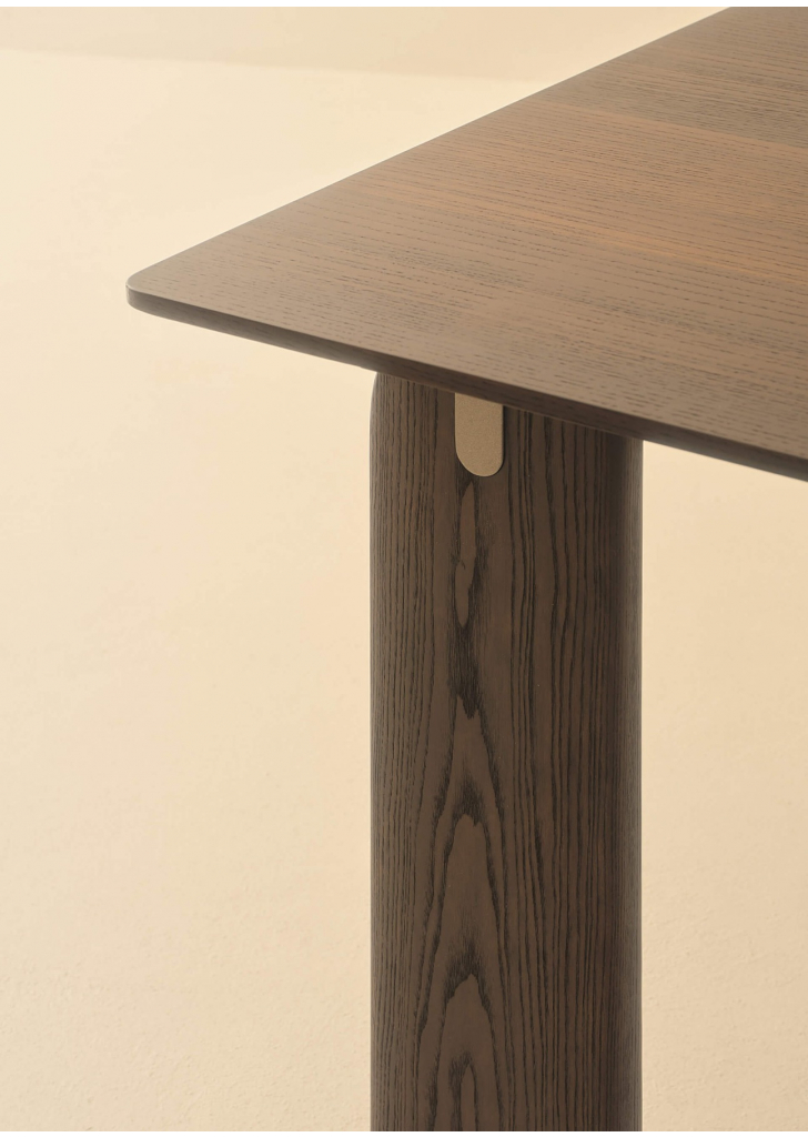 並崁上精緻的金屬嵌件,與木材形成明顯視覺對比的現代元素。