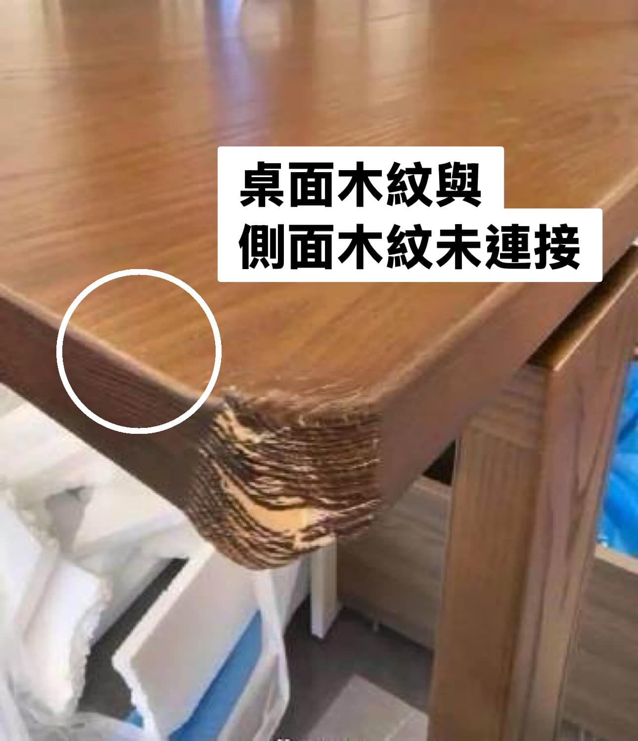 再仔細一看 桌面的木紋走向跟桌面側邊的居然沒有連接!