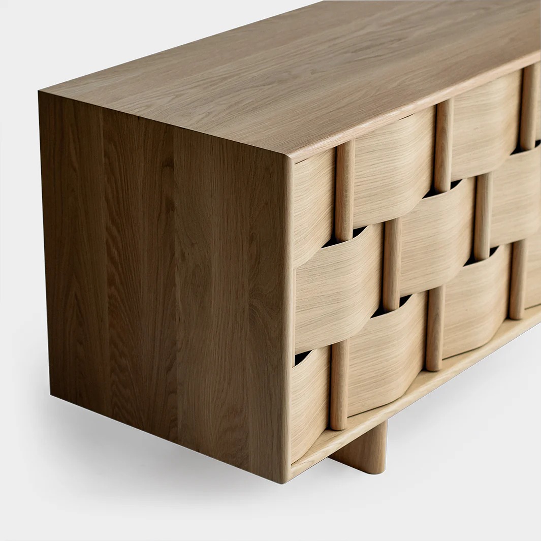 設計師 Lukas Dahlén 將靈感聚焦於最基礎的木材編織(Wood Weaving)工藝。他巧妙地將這種原本用於柔軟材質的編織手法,以實木打造出波浪般的律動感, 使之成為櫃體最搶眼的立面細節,形成一種「柔韌環繞穩定結構」的視覺張力,完美平衡了簡約與精緻。