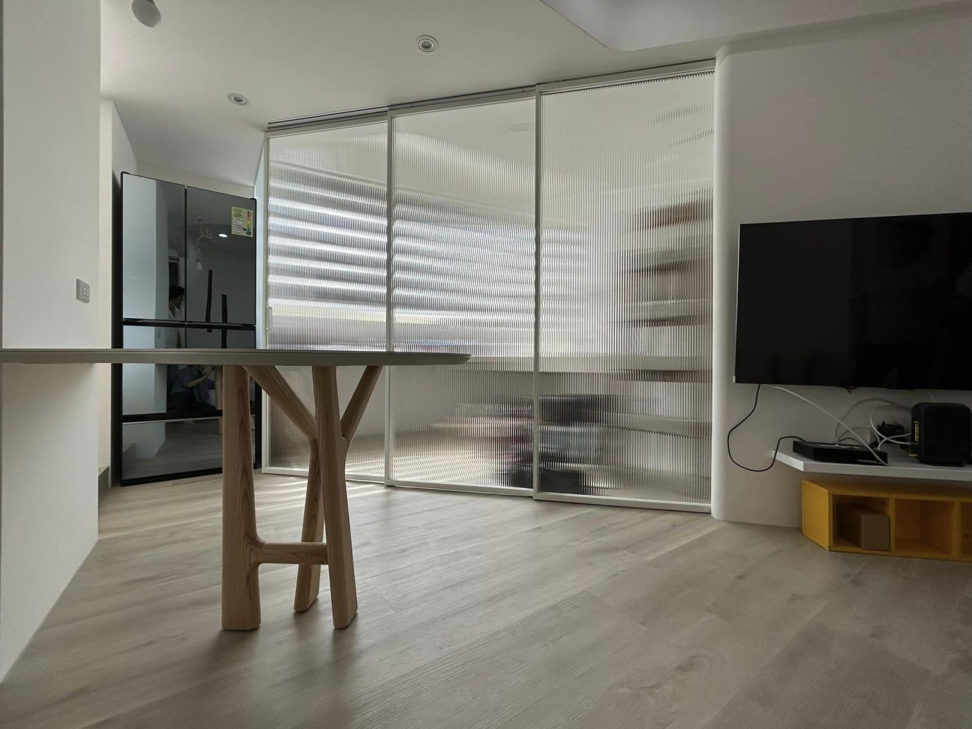 俏皮的樹根餐桌與通透的長虹玻璃光影相輔相成