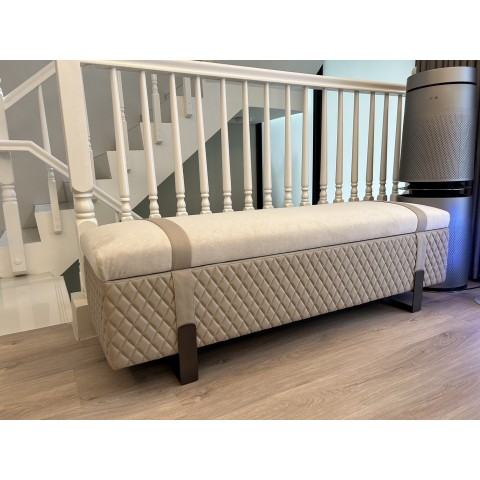 業主一直有煩惱,客人來作客,但客廳沒有地方可以放包包 每次宴客只能讓客人把放地上,但是又不想用置物架。 最後決定做可以當座位使用,也可以收納客人包包的長凳。 坐面使用絲絨般會閃色的絨布,搭配皮革製的皮帶與菱格紋底座 用最低調柔和的顏色,搭配奢華的元素,鐵件、皮革、菱格。...