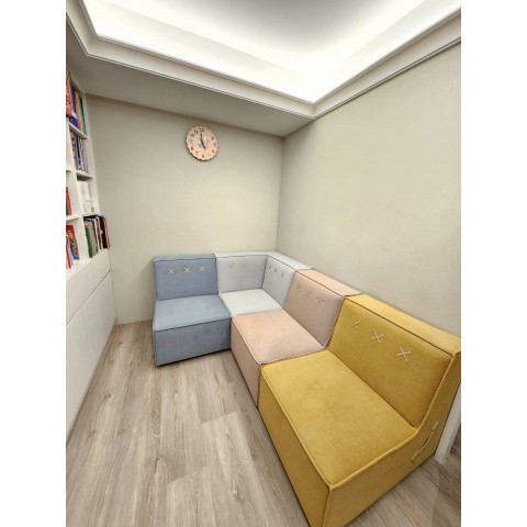 小朋友的成長只有一次 稍縱即逝 自上次可愛貓咪和兔子床 業主家有一個小空間是給小朋友看故事使用的 但是礙於空間不大,一直沒有擺放任何的椅子 小朋友在看書的過程,並不能太舒適閱讀 最後決定選了這組,可以單獨分開使用 也可以併在一起使用的童趣沙發 家中成員共4個小朋友 每個小朋...